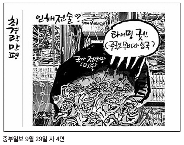 ½Å¹®À±¸®À§¿¡ µû¸£¸é ÁߺÎÀϺ¸ÀÇ ¸¸ÆòÀº ±¹°¡Á¤º¸ÀÚ¿ø°ü¸®¿øÀÇ ÈÀç·Î ±¹°¡ Àü»ê¸ÁÀÌ ¡®¸ÔÅ롯ÀÌ µÈ »óȲ¿¡¼ Áß±¹ÀÎ ¹«ºñÀÚ ÀÔ±¹ÀÌ ÀÌ·ïÁø Á¡À» ¼ÒÀç·Î »ï¾Ò´Ù. ´Ù¼öÀÇ Áß±¹ÀεéÀÌ ±¹°¡Àü»ê¸Á¿¡ ¶Õ¸° ±¸¸ÛÀ» ÅëÇØ ¸ô·Á¿À´Â »óȲÀ» ¹¦»çÇÏ¸é¼ ¡¸ÀÎÇØÀü¼ú?¡¹À̶ó´Â Á¦¸ñÀ» ´Þ¾Ò´Ù. ±×¸®°í ¹«ºñÀÚ ÀÔ±¹ÇÏ´Â Áß±¹ÀεéÀÇ ¡°Å¸ÀÌ¹Ö ±Â!!¡±À̶ó´Â ¸»Ç³¼±À» ´Þ¾Ò´Ù.