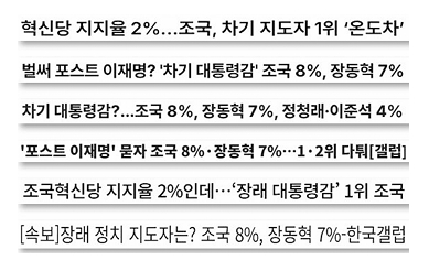 À̹ø¿¡ ¡®ÁÖÀÇ¡¯ Á¶Ã³¸¦ ¹ÞÀº ÀϺΠ±â»ç°¡ ´Ù·é Çѱ¹°¶·´ÀÇ Â÷±â Á¤Ä¡ ÁöµµÀÚ ¼±È£µµ Á¶»ç(9¿ù 16~18ÀÏ, 1001¸í, ÀÀ´ä·ü 11.8%, ÀüÈÁ¶»ç¿ø ÀÎÅÍºä ¹æ½Ä, Ç¥º»¿ÀÂ÷´Â 95% ½Å·Ú¼öÁØ¿¡ ¡¾3.1%Æ÷ÀÎÆ®)¸¦ º¸¸é Á¶±¹ Á¶±¹Çõ½Å´ç ºñ»ó´ëÃ¥À§¿øÀå 8%, À嵿Çõ ±¹¹ÎÀÇÈû ´ëÇ¥ 7%, Á¤Ã»·¡ ´õºÒ¾î¹ÎÁÖ´ç ´ëÇ¥¡¤ÀÌÁؼ® °³Çõ½Å´ç ´ëÇ¥ °¢ 4%, ±è¹Î¼® ±¹¹«ÃѸ®¡¤Çѵ¿ÈÆ Àü ±¹¹ÎÀÇÈû ´ëÇ¥¡¤±è¹®¼ö Àü ±¹¹ÎÀÇÈû ´ë¼±Èĺ¸ °¢ 3%, ¿À¼¼ÈÆ ¼¿ï½ÃÀå 1%¿´´Ù.